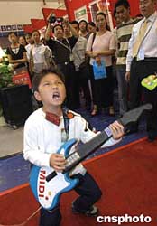九月二十三日,一位彈吉它的搖滾小朋友在青島會(huì)展中心為在這里舉行的2004青島國際時(shí)裝周助興。作者:史利