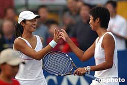 中新社北京九月二十四日電(記者高凱)首屆中網(wǎng)公開賽女雙比賽今天繼續(xù)進(jìn)行,雅典奧運(yùn)會(huì)冠軍,中國選手李婷/孫甜甜以二比零輕取另一對(duì)中國選手彭帥/謝彥澤,順利晉級(jí)四強(qiáng)。