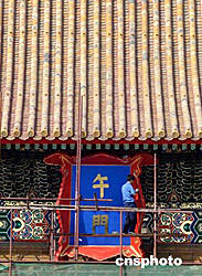九月末,一名工人正在高高的北京故宮午門匾額處進(jìn)行維修。北京故宮正在進(jìn)行自建成以來最大規(guī)模的修繕,到2005年10月之前將完成第一階段的大修,主要進(jìn)行午門、欽安殿和中軸線周圍廡房的維修。故宮大修工程將于2020年全部完成。對正在進(jìn)行的故宮修繕工程質(zhì)量,各方人士莫衷一是。中新社記者:張煒