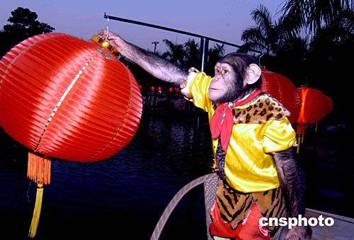 兩歲大的猩猩“俊俊”客串“工程師”在湖邊掛上節(jié)日的燈籠。
