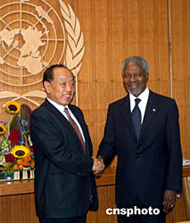 當(dāng)?shù)貢r(shí)間九月二十七日,正在紐約聯(lián)合國(guó)總部出席第五十九屆聯(lián)大的中國(guó)外長(zhǎng)李肇星與聯(lián)合國(guó)秘書長(zhǎng)安南會(huì)晤,雙方就聯(lián)合國(guó)作用、改革和發(fā)展以及蘇丹達(dá)爾富爾等問題交換了看法。作者:趙海燕