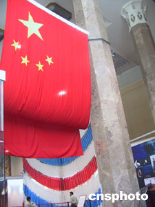 圖為“神舟”五號(hào)飛船搭載的五星紅旗,其后蘭白紅相間的巨大降落傘是“神舟”五號(hào)飛船返回著陸時(shí)使用的主降落傘。