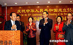 當?shù)貢r間九月二十九日晚,正在紐約聯(lián)合國總部出席第五十九屆聯(lián)大的中國外長李肇星(左)前往中國駐紐約總領館,與當?shù)貎S胞共同歡度中華人民共和國成立五十五周年。圖中從右至左為:中國常駐聯(lián)合國代表王光亞和夫人、中國駐紐約總領事劉碧偉和夫人、中國常駐聯(lián)合國副代表張義山。作者:趙海燕
