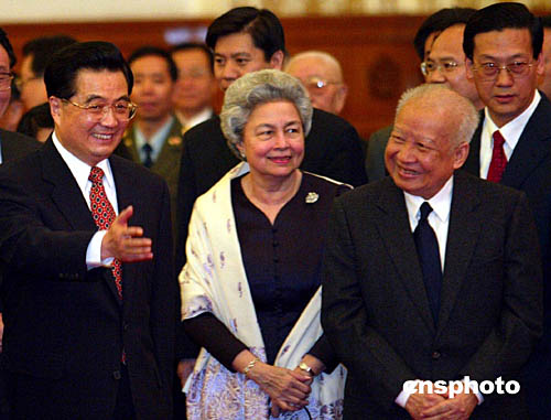 中國國家主席胡錦濤與柬埔寨西哈努克國王和王后等出席國慶招待會。