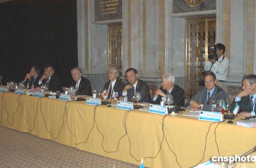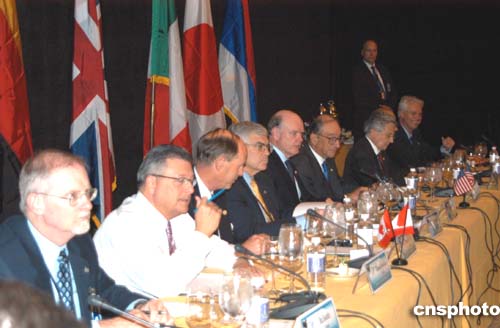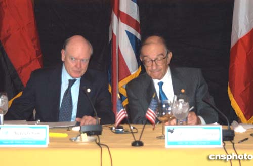 美國(guó)財(cái)長(zhǎng)斯諾(左)與美聯(lián)儲(chǔ)主席格林斯潘(右)1日參加G7與中國(guó)的首次部長(zhǎng)級(jí)對(duì)話會(huì)。中新社記者:余東暉