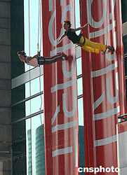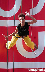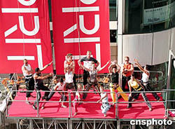 15名模特在樓高6層的外墻舞臺上表演,優(yōu)雅的動作淋漓盡致地把設(shè)計師的作品表演出來。