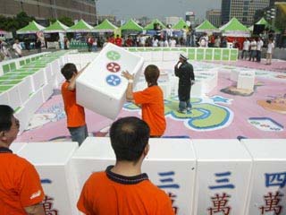 中新網(wǎng)10月9日電 臺北一家網(wǎng)絡麻將游戲公司今日舉辦了一場別開生面的超級大麻將比賽,參賽者必須使用90厘米長、60厘米寬及50厘米高的麻將一決勝負,第一名將獲得獎金新臺幣1萬元。