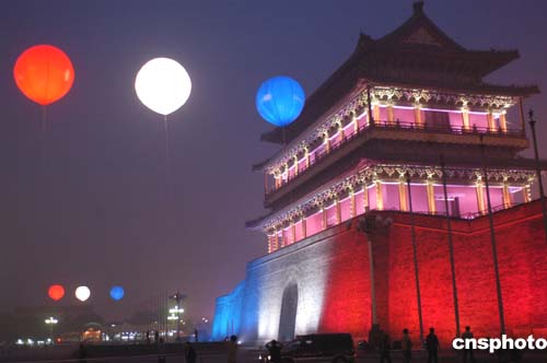 正當(dāng)法蘭西共和國總統(tǒng)希拉克對(duì)中國進(jìn)行國事訪問之際,及中法文化年將進(jìn)入第二個(gè)階段——中國舉辦“法國文化年”一系列活動(dòng)之時(shí),十月九日下午六時(shí)許,北京天安們廣場(chǎng)南側(cè)正陽門樓披上象征法國國旗紅白蘭三色艷麗燈光,八組二十四盞千瓦紅白蘭燈光彩色氣球環(huán)繞天安門廣場(chǎng),營造出一派中法友誼歡樂景象。在十月十日,法國文化年將在中國將正式拉開帷幕。作者:鄒憲