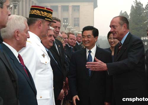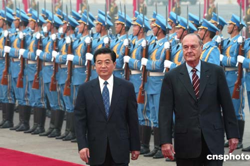 中國國家主席胡錦濤十月九日在北京舉行儀式,歡迎法國總統(tǒng)希拉克訪華。中新社記者:滿會喬