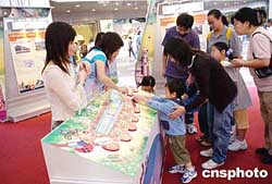 香港九廣鐵路周日在時代廣場舉辦展覽,推介馬鞍山、尖沙嘴新支線,進一步拓展鐵路網(wǎng)絡,計劃在2004年底落成。圖為市民參觀展覽。作者:洪少葵