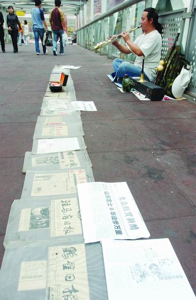 他面前的地上除了用來(lái)賣藝的薩克斯管、巴烏、嗩吶、笛子和葫蘆絲,還有20多份攤在地上的報(bào)紙剪報(bào),剪報(bào)的內(nèi)容全都是包括《華西都市報(bào)》《重慶晚報(bào)》在內(nèi)的山東、四川等地地方報(bào)紙對(duì)他的相關(guān)報(bào)道。