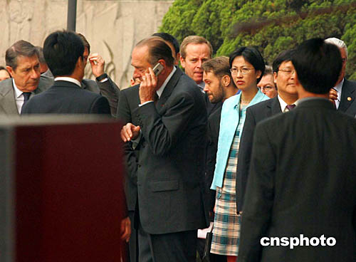 十月十一日,法國總統(tǒng)希拉克訪問上海,圖為他在繁忙的行程中接聽手機。作者:潘索菲