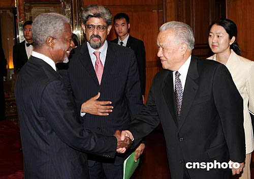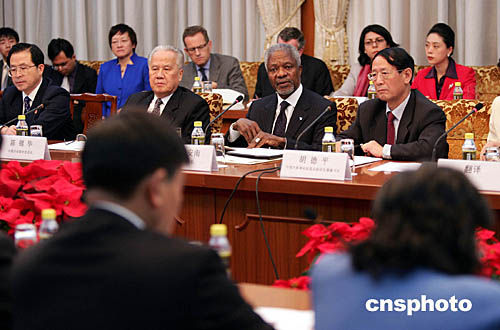 聯(lián)合國秘書長安南十月十一日在北京釣魚臺國賓館與中國企業(yè)家聯(lián)合會會長陳錦華(左二)、中國光彩事業(yè)促進(jìn)會副會長胡德平(右一)等中國企業(yè)家代表座談,共同探討“企業(yè)承擔(dān)的社會責(zé)任”等問題。