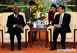 中新網(wǎng)10月12日電 據(jù)中國外交部網(wǎng)站消息,2004年10月12日下午,國家主席胡錦濤在人民大會堂會見了來華訪問的聯(lián)合國秘書長科菲·安南。