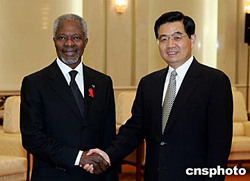 安南感謝胡錦濤主席的會見,表示贊同胡主席對國際形勢的分析和看法,感謝中國政府長期以來對聯(lián)合國和他本人工作的支持。安南說,中國在國際事務中的作用和影響正日益上升,是維護世界和平與發(fā)展的重要力量。在實現(xiàn)聯(lián)合國提出的千年發(fā)展目標方面,中國政府取得了積極的成果。聯(lián)合國改革的目的是使聯(lián)合國更好地應對各類威脅與挑戰(zhàn),需要包括中國在內(nèi)的廣大會員國繼續(xù)給予大力支持。