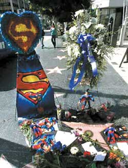 享年52歲的“超人”克里斯托夫·里弗墜馬癱瘓后對(duì)抗病魔的毅力與勇氣深植影迷心中,從10月11日開始,在美國(guó)好萊塢星光大道上,人們駐足拍攝擺放在已故演員克里斯托夫·里弗名字前的照片、短信和鮮花。而當(dāng)年《超人》電影在紐約的拍攝景點(diǎn)——“超人”擔(dān)任記者的報(bào)社大樓,也有許多影迷前往憑吊。電影中,“超人”每天上班的報(bào)社“DAILYPLANETNEWS”所在的大樓,隨著電影的走紅而有了“超人大樓”的稱號(hào),所以在克里斯托夫·里弗過世的消息傳出后,紐約人紛紛來到這里懷念心中的偶像。一名紐約影迷說:“這是‘超人’大樓,大家都會(huì)來這里看有名的地球標(biāo)志,這同時(shí)也是新聞大樓,是有名的觀光景點(diǎn)!