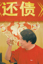 10日晚上,《還債》劇組舉行了開(kāi)機(jī)宴,由于高速公路起霧,牛群從北京趕到石家莊的時(shí)候已經(jīng)是晚上8點(diǎn)鐘。當(dāng)牛群一臉疲憊地出現(xiàn)的時(shí)候,他那已經(jīng)成為“攝影師、平民縣長(zhǎng)”標(biāo)志的馬甲并沒(méi)有穿在身上,而只穿了件紅色T恤和一件運(yùn)動(dòng)外套。讓記者感到第二個(gè)變化的是牛群的話(huà)少了,開(kāi)機(jī)宴上男主角牛群自然少不了講話(huà),人們滿(mǎn)懷期待他能夠講出如相聲般的精彩話(huà)語(yǔ),可牛群只說(shuō)了兩句客套話(huà)便沒(méi)了下文,在給各桌敬酒的時(shí)候他的話(huà)更少,只是端一下酒杯而不開(kāi)口。