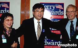 當(dāng)?shù)貢r(shí)間十月十三日,美國(guó)第一位華裔州長(zhǎng)、華盛頓州州長(zhǎng)駱家輝(中)前往紐約華埠,為民主黨總統(tǒng)候選人克里爭(zhēng)取亞裔選票。當(dāng)晚,克里和布什進(jìn)行了最后一場(chǎng)美國(guó)大選辯論。作者:趙海燕