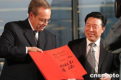 十月十四日,參加國際文化政策論壇第七屆文化部長年會的法國文化部長德瓦布萊先生和中國文化部長孫家正在上海國際會議中心就中法共同舉辦文化年活動的影響展開專題討論。中新社記者:廖文靜