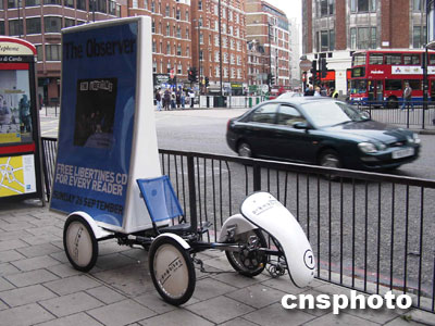 倫敦街頭一輛造型奇異的、用于打廣告的自行車(chē)。余瑞冬 攝