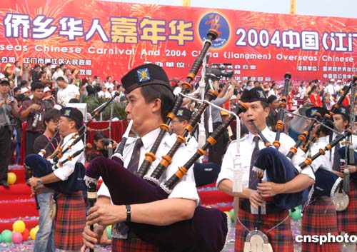 中新社江門十月十七日電(記者邢利宇)今天上午,彩旗、彩球、花車、巡游表演隊(duì)把廣東江門市東湖廣場(chǎng)裝扮一新,來自世界各地的華僑華人、港澳同胞及內(nèi)地各界嘉賓兩千多人歡聚于此,“中國(guó)(江門)僑鄉(xiāng)華人嘉年華暨二OO四中國(guó)(江門)僑鄉(xiāng)旅游節(jié)”在熱烈的氣氛中隆重開幕。