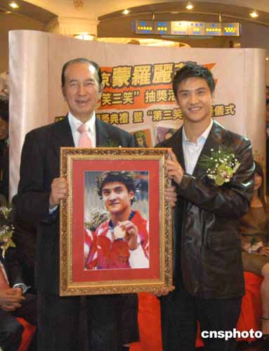 田亮向澳博行政總裁何鴻燊博士贈送奧運金牌照片留念。作者:梁永強