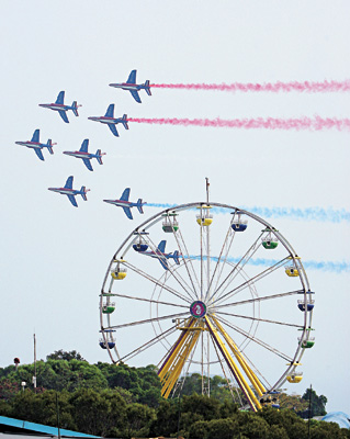 擔(dān)任特技表演的八架阿爾法戰(zhàn)機(jī),在港島海面上空排列出菱形、雁行、箭形及十字形等不同隊(duì)型,并不斷做出空中翻跟斗、急轉(zhuǎn)彎、突然分散及對飛等被人形容為“空中芭蕾”的連串高難度花式表演動(dòng)作。表演中飛機(jī)尾部噴灑出象征法國國旗的紅、白、藍(lán)三種彩色煙霧,在空中形成美麗的圖畫。約半個(gè)小時(shí)的精彩特技飛行引得香江觀眾陣陣歡呼和贊嘆。