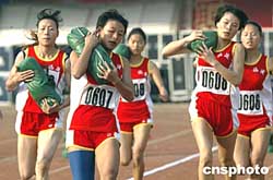 田徑比賽中的六十米五人抗洪搬沙包賽也顯示出了農(nóng)運會貼近農(nóng)民生活的特色,圖為女子六十米五人抗洪搬沙包賽中福建的五位參賽選手奮勇爭先。作者:盛佳鵬