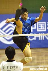 在毽球比賽中,精彩場面不斷呈現(xiàn)。圖為男子單打比賽中四川參賽選手躍起進攻。作者:盛佳鵬