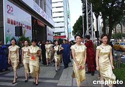 匯豐銀行10月21日舉行在臺(tái)二十周年慶暨信義分行開幕儀式,男女職員唐裝亮相,圖為女職員著旗袍走過位于臺(tái)北一0一大樓附近的信義分行新址。作者:張明新