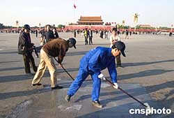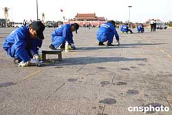 10月23日,清潔工人正在北京天安門廣場(chǎng)對(duì)已經(jīng)發(fā)黑的花崗巖地面進(jìn)行清洗。清洗工作完成后,廣場(chǎng)地面將恢復(fù)淡粉色原貌。清洗工作原計(jì)劃在十天內(nèi)完成,但由于污漬太多,加上清理口香糖等污漬難度大,估計(jì)此次廣場(chǎng)大“洗臉”將會(huì)延期完成。作者:張煒