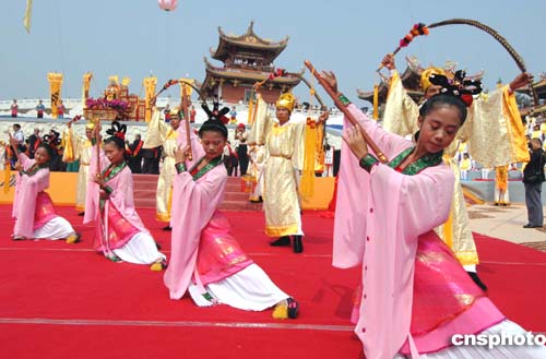 第二屆澳門媽祖文化旅游節(jié),二十二日在澳門天后宮隆重揭幕,并舉行了氣勢(shì)恢宏的媽祖祭祀大典,在“平安曲 ”中藝員起舞頌媽祖 。作者:梁永強(qiáng)