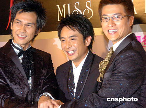 2004亞洲小姐競選總決賽,于十月二十四日晚在香港演藝學(xué)院舉行,香港藝員陳啟泰(左)、梁思浩(中)、林韋辰(右)擔任競選決賽司儀。中新社記者:錢興強