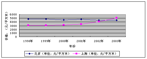 但從動(dòng)態(tài)上看,商品房空置面積并沒有增加,而是呈下降趨勢(shì)。2004年8月底,商品房空置面積0.97億平方米,同比減少0.8%,比去年底減少3%。這說明當(dāng)前的房地產(chǎn)空置問題并未惡化。我們認(rèn)為,對(duì)于房地產(chǎn)空置現(xiàn)象,必須從兩個(gè)方面認(rèn)識(shí):一方面,房地產(chǎn)空置占?jí)捍罅抠Y金,其中部分形成不良資產(chǎn);另一方面,一定規(guī)模的空置對(duì)正常的房地產(chǎn)市場(chǎng)是完全必要的,它實(shí)際上在某種意義上是一種“庫(kù)存”,從而發(fā)揮平抑房?jī)r(jià)的作用。從圖3的對(duì)比可以看出,上海市近幾年房地產(chǎn)供銷兩旺,不僅沒有出現(xiàn)大量空置,連部分以前積壓的房子也賣出去了,而房?jī)r(jià)表現(xiàn)為一路飆升;北京市則房?jī)r(jià)比較穩(wěn)定,甚至穩(wěn)中有降,其中房地產(chǎn)空置對(duì)房?jī)r(jià)上升起到的抑制作用不可忽視。