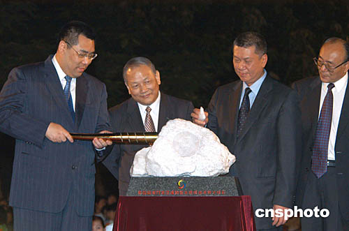 澳門特首何厚鏵在金蓮花廣埸接過中國雅典奧運金牌得主勞麗詩和澳門運動員李廣祥傳遞的“開元”之火火炬