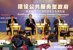 眾多政府官員、外國大使與國內(nèi)外一批著名專家學者十月三十日云集?,出席正在此間舉行的中國改革國際論壇,就政府轉(zhuǎn)型相關(guān)問題進行深入探討。圖為高尚全、衛(wèi)留成、陳錦華、科勒德克(從左到右)在論壇上。作者:顧時宏