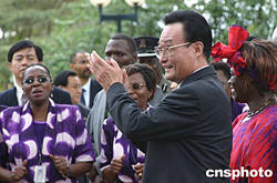 吳邦國(guó)委員長(zhǎng)來到聯(lián)合國(guó)駐內(nèi)羅畢總部,受到當(dāng)?shù)刂铣獔F(tuán)的熱烈歡迎。