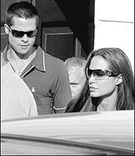 記者近日在彼特和朱莉演對(duì)手戲的新片《史密斯夫婦》的片場(chǎng)拍到了他們兩人一邊找感覺(jué)一邊打趣嬉笑的照片,照片顯示,彼特和朱莉都戴著茶色眼鏡,顯得很酷的樣子,留著寸頭的彼特穿著一件棕色T恤,朱莉則穿著一件幾乎相同顏色的半透明繡花上裝,一頭金發(fā)隨意地披在肩膀上,顯得性感又不失清純,兩人站在一起的模樣的確是很有情人像。不知是否是劇中的要求,這張照片中的彼特正盯著朱莉看得入神,而朱莉也許是看到有記者在場(chǎng)的原因而故意轉(zhuǎn)過(guò)頭去沒(méi)有迎合彼特的灼人目光。