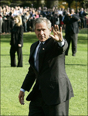 中新網(wǎng)11月3日電 據(jù)法新社報道,11月2日,在奔波了數(shù)州拉票之后,布什總統(tǒng)乘坐“海軍陸戰(zhàn)隊一號”直升機回到白宮,等待選舉結果。圖為布什下機之后,向民眾揮手致意,臉上充滿了疲倦,但也顯示出他的自信。(春風)