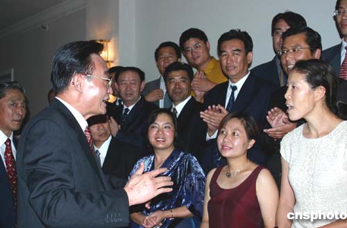 十一月五日正在贊比亞首都盧薩卡訪問的全國人大常委會委員長吳邦國看望了當?shù)厝A人華僑、使館和中資企業(yè)工作人員。吳邦國在詢問中國農(nóng)墾總公司員工李莉有關情況后高興地表示,農(nóng)業(yè)在贊比亞大有可為。作者:張量