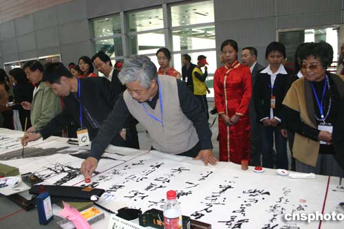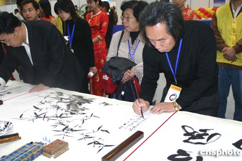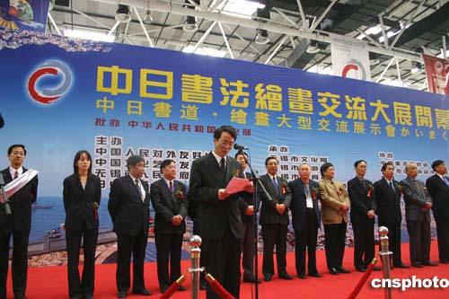 中新網(wǎng)11月6日電(記者邱觀史)為期三天的“中日書法繪畫交流大展”6日在美麗的太湖之濱江蘇無(wú)錫拉開(kāi)帷幕。百名中日書畫家展示他們傾心裝做的200余幅作品,為觀眾獻(xiàn)上極富美感的視覺(jué)享受。中國(guó)文化部副部長(zhǎng)常克仁出席開(kāi)幕式并發(fā)表講話。