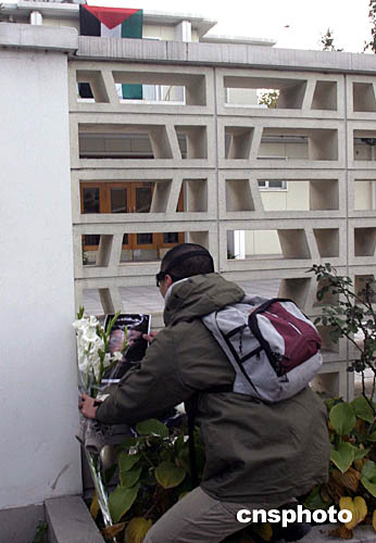 十一月十一日下午,由一些北京市民和學(xué)生自發(fā)敬獻的一簇簇鮮花擺放在巴勒斯坦國駐華使館門前,表達他們對巴勒斯坦國總統(tǒng)、巴民族權(quán)力機構(gòu)主席阿拉法特的哀悼。阿拉法特當天在法國巴黎病逝。中新社記者:張煒