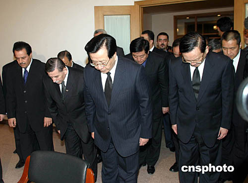中新社北京十一月十一日電 (記者李靜)中國國家副主席曾慶紅十一日到巴勒斯坦國駐華使館,代表中國政府吊唁巴勒斯坦國總統(tǒng)、巴勒斯坦民族權力機構主席亞西爾·阿拉法特逝世并敬獻花圈。國務委員唐家璇陪同前往吊唁。