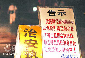 中新網(wǎng)11月12日電 據(jù)新快報報道,面對色誘搶劫案件重新抬頭,廣州警方除出動大批警力清掃市內(nèi)“企街女”集中地外,日前更在“高危地段”豎起警示牌,警告“好色男士潔身自愛,以免受騙人財兩空”。