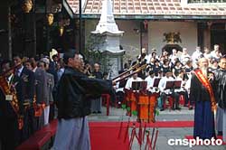今天上午十時三十分,本社記者來到臺北市大龍峒保安宮。這里香火繚繞,正在舉行富有道家特色的三獻(xiàn)禮大典。在莊嚴(yán)肅穆的三通鼓后,迎神、進(jìn)饌、上香、三獻(xiàn)禮依次進(jìn)行。保安宮合唱團(tuán)及樂團(tuán)吟唱《保生大帝靈跡歌》,宣揚保生大帝的保生護(hù)民、慈悲胸襟。