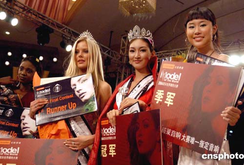 二零零四星際世界模特大賽全球總決賽,十一月十四日晚在廣東珠海舉行,五十位來自全球四十一個(gè)國家的專業(yè)模特參加角逐。泰國選手(中)獲得冠軍,烏克蘭選手(左)獲得亞軍,中國王琤(右)獲得季軍。作者:劉衛(wèi)勇