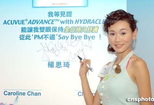 藝員楊思琦11月15日在香港出席全新ACUVUE隱形眼鏡新聞發(fā)布會(huì),楊思琦試用產(chǎn)品后,見證簽名推介。作者:鄧慶樂(lè)