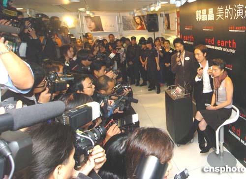郭晶晶在現(xiàn)場(chǎng)接受化妝品公司高層贈(zèng)送的禮品。作者:趙振清