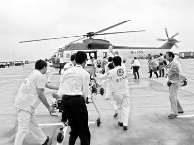 機場濃煙滾滾,兩輛消防車對準飛機噴水,機組迅速打開艙門,施放緊急滑梯疏散旅客。機場醫(yī)療急救力量8輛救護車、60名擔架隊員也到達現場,醫(yī)療人員根據受傷輕重分別在場地上不同區(qū)域插上紅、黃、綠、黑、白五色旗,擔架隊員抬著擔架沖向失事飛機迅速將傷員轉離飛機,送往臨時搭建的醫(yī)療驗傷區(qū)。
