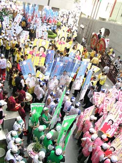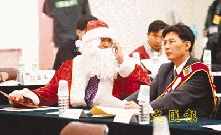 53位臺北縣“立委”參選人17日上午齊聚體育場進行號次抽簽,為了搶鏡頭,各出奇招,有人扮成媽祖、還有人扮成了包青天、圣誕老人。支持者在現(xiàn)場揮舞旗幟、高舉活動招牌,大喊“當(dāng)選”。
